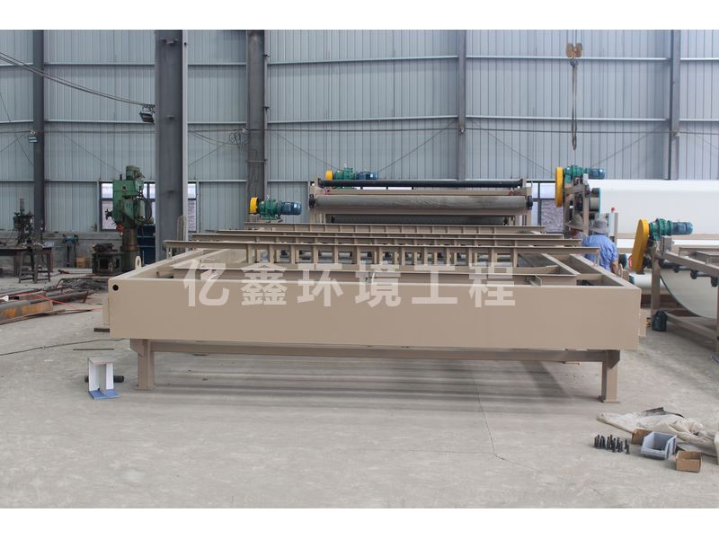 本設(shè)備由機(jī)架、傳動(dòng)系統(tǒng)、壓榨系統(tǒng)、濾布及清洗管路、卸料裝置、集液裝置、和電氣控制系統(tǒng)等組成。工作原理是,含水率很高的污泥物料,經(jīng)過絮凝后,呈大顆粒狀,由進(jìn)泥管路到網(wǎng)布脫水區(qū),經(jīng)過脫水后的物料慢慢進(jìn)入預(yù)壓區(qū),通過輥?zhàn)勇齻鲃?dòng)進(jìn)入壓榨高壓區(qū),經(jīng)過高壓區(qū)脫水后,泥漿就形成餅狀由卸料裝置排出。